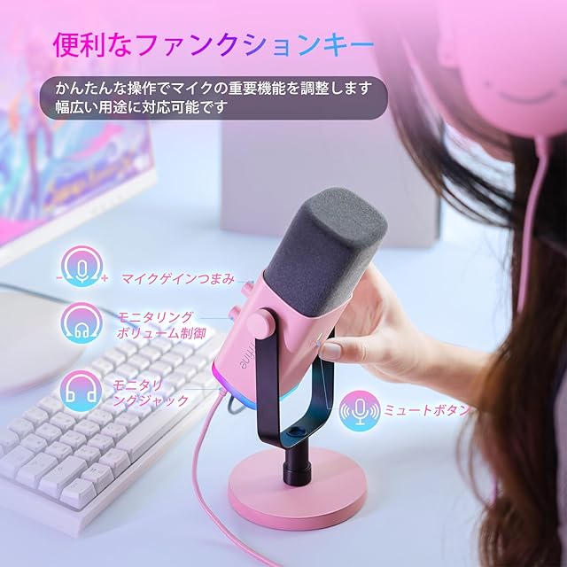 商品名:FIFINE USB/XLRスタンドアロンマイク 単一指向性 ダイナミックマイク PC/PS4/PS5対応 ミュートボタン RGBライティング 音量調節 ヘッドフォン端子付き オーディオミキサー対応可能 ポッドキャスト テレワーク ストリーマー コンテンツクリエーター ゲーマー向け ボイスチャット 録音 ゲーム実況 動画配信 ピンク AmpliGame AM8P