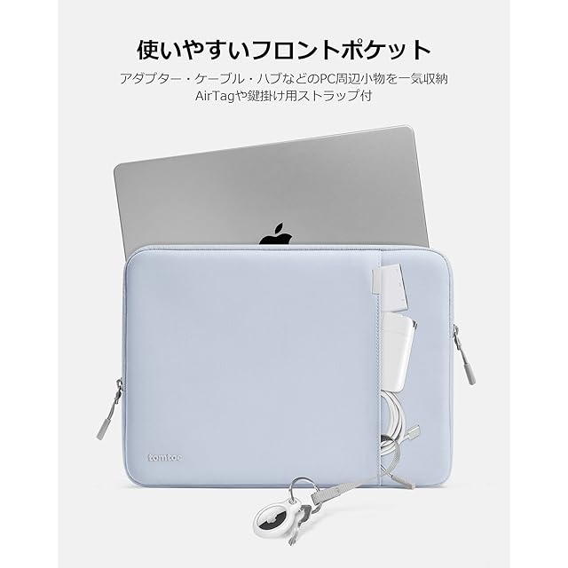 【使いやすいフロントポケット】ノートPC以外も持ち回る必需品が必ずあります。ジッパー型フロントポケットはKindle、アダプター、ケーブル、マウス、ハブ、USBメモリ、イヤホンなどのPC周辺小物を一気に収納できます。AirTagや鍵掛け用ストラップ付。この軽量でコンパクトなラップトップ保護ケースは他のショルダーバッグ、バックパックに簡単に収納できます。