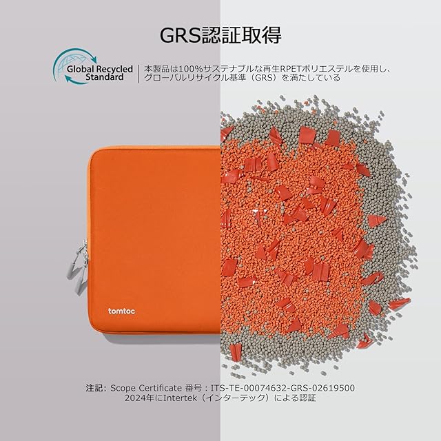 【サステナビリティと品質の融合】 GRS認証(グローバル・リサイクル・スタンダード)を取得したこのノートパソコンケースは、環境に優しい素材と優れたクラフトマンシップを兼ね備えています。撥水加工されたリサイクル生地を使用し、安心のYKKジッパーと柔らかな裏生地が特徴です。何百万本もの廃棄されたプラスチックボトルを再利用して、耐久性と高い機能性を実現したデザインです。tomtoc製品は全て12ヶ月間安心付きます。