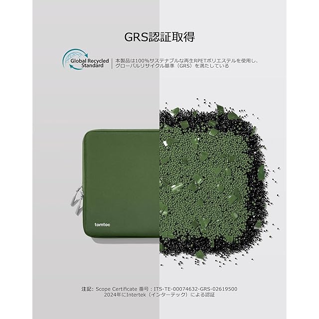 【サステナビリティと品質の融合】 GRS認証(グローバル・リサイクル・スタンダード)を取得したこのノートパソコンケースは、環境に優しい素材と優れたクラフトマンシップを兼ね備えています。撥水加工されたリサイクル生地を使用し、安心のYKKジッパーと柔らかな裏生地が特徴です。何百万本もの廃棄されたプラスチックボトルを再利用して、耐久性と高い機能性を実現したデザインです。tomtoc製品は全て12ヶ月間安心付きます。