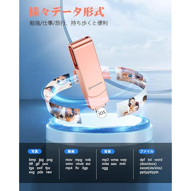 PHICOOL 4in1 USBメモリ 256GB【完全アプリ不要】から直接保存 外付けストレージ ▼3秒で始まるスマート生活 phoneのアルバムを開く→保存したい写真を選択→「USBへ転送」をタップ。 これだけで瞬時にデータ保存!クラウドサービスの月額費もWi-Fi環境も不要。 ▼2024年最新モデル完全対応 └ 16 Pro Max/16シリーズ~ 8まで全世代対応 └pad Pro(M2チップ搭載機種)/MacBook Air 15インチ等最新端末でも安定動作 └Type-C××USB3.0×MicroUSBの4WAY接続 ▼PHICOOLだけの5大革新 軍事級保護:航空アルミニウム合金ケース+内部緩衝材で2m落下耐性 超直感設計:カラー図解マニュアル+動画サポート(日本語専任スタッフ常駐) 潔癖症対応:抗菌加工ライトニングキャップ(99.9%菌繁殖抑制) 完全静音:無駄なLEDランプ廃止で会議中も安心使用 和風美学:桜模様刻印の収納ポーチ付属 ▼こんな方に必需品 ✓「Cloudの課金を解約したい」 ✓「孫の動画でスマホがパンク寸前」 ✓「機種変更時のデータ移行が面倒」 ✓「ビジネスデータの物理バックアップが必要」 ▼仕様詳細 ・転送速度:HD動画1GB約12秒 ・対応形式:HEIC/RAW/MP4/PDF等37種 ・動作環境:-20℃~60℃(雪山旅行でも問題なし) ・サイズ:親指サイズ(5.8×1.4cm) ・重量:ストラップ付きでも3.5g