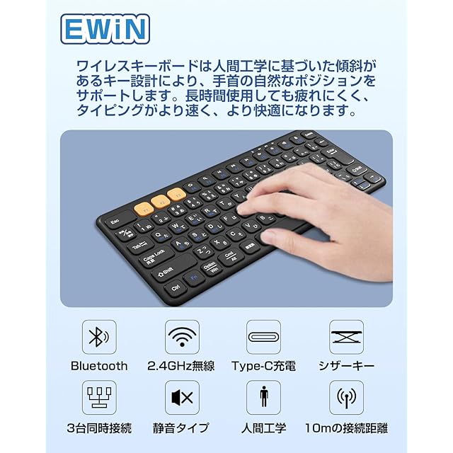 商品名:Ewin キーボード Bluetooth ワイヤレス 無線 2.4GHz(USBレシーバー付属)コンパクト Type-C充電式 JIS基準 日本語配列 静音 薄型 軽量 人間工学設計 マルチペアリング 三台デバイス対応 PC iPad スマホ用 Windows Mac iOS Android対応 持ち運び簡単 日本語取扱説明書付き ブラック