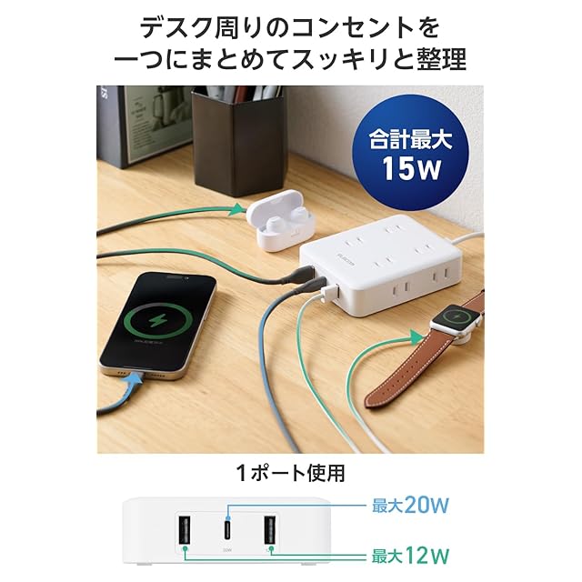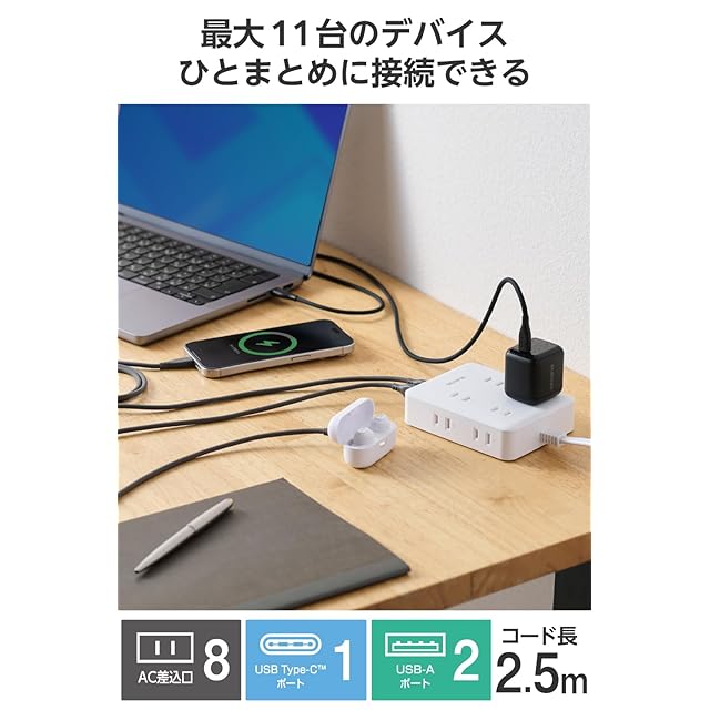 ACタップとUSBポートが一体になった、スマートフォンとワイヤレスイヤホンなどを同時に充電できるUSB付きコードタップです。デスク周りのコンセントを一つにまとめてスッキリと整理できます。
