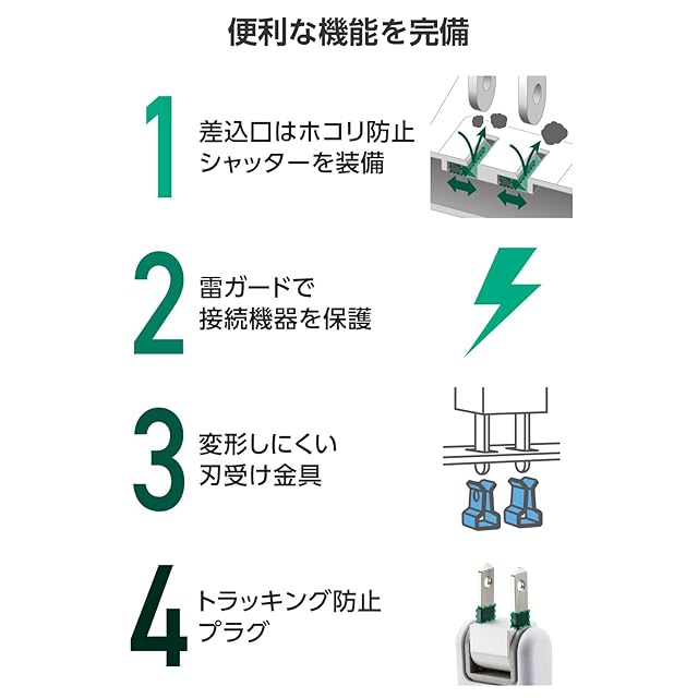 筐体にはUL94 V-0グレードの高い難燃性を備えたPC樹脂、AC差込口の周りには熱硬化性のユリア樹脂を用いた二重構造で、万が一の発熱の際に融解しにくく、電気火災の防止に有効です。
