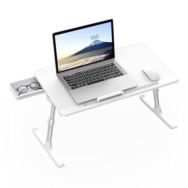ラップデスク SAIJI ノートパソコンスタンド 折りたたみテーブル ローテーブル 膝上テーブル 高さ・角度調整 引き出し付き 耐荷重40kg PVC表層 軽量 省スペース 勉強机 傾斜台 読書 テレワーク 一人食 K7-M (ホワイト,60*32cm)