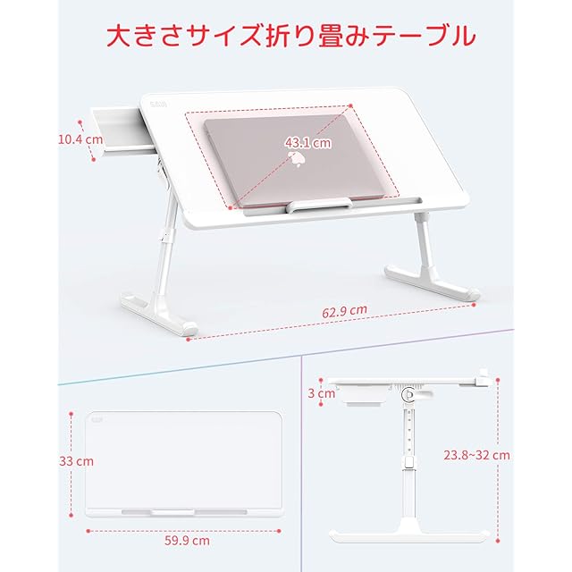 商品名:ラップデスク SAIJI ノートパソコンスタンド 折りたたみテーブル ローテーブル 膝上テーブル 高さ・角度調整 引き出し付き 耐荷重40kg PVC表層 軽量 省スペース 勉強机 傾斜台 読書 テレワーク 一人食 K7-M (ホワイト,60*32cm)