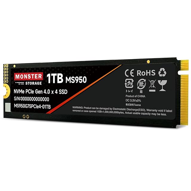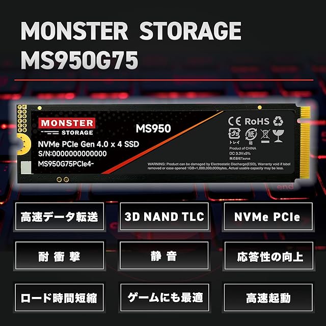商品名:Monster Storage 1TB NVMe SSD PCIe Gen 4×4 最大読込: 7,400MB/s 最大書き:6,600MB/s PS5確認済み 放熱シート付き M.2 Type 2280 内蔵 SSD 3D TLC 国内正規品 メーカー5年 MS950G75PCIe4-01TB