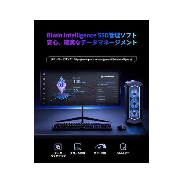【Acer Predator GM7000 SSD】Predatorとは、最新テクノロジーを搭載し、幅広いラインアップを揃えたAcerのゲーミングシリーズです。その傘下の最新のGen 4x4 NVMe コントローラと3D TLC NANDに基づいて設計されたGM7000 M.2 SSDは超高速かつ安定感のあるパフォーマンスを提供できます。ゲームやアプリケーションのロード時間から、ストリーミングやキャプチャまで、システム全体の応答性が大幅に向上します。