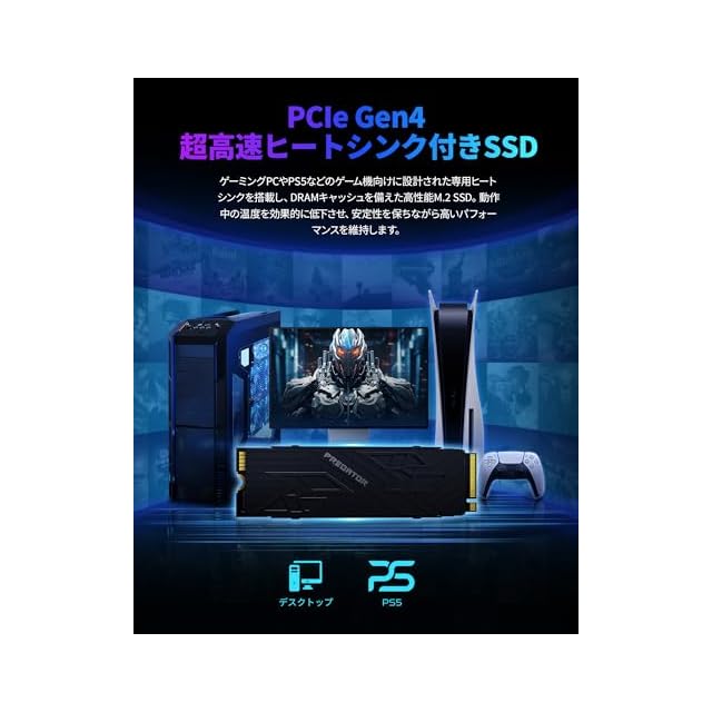 商品名:Acer Predator GM7000 ヒートシンクモデル M.2 SSD 1TB PS5/PS5 Pro動作確認済み DRAMキャッシュ搭載 NVMe 2280 PCIe Gen4×4 超高速(最大読み取り:7400MB/s、最大書き込み:6700MB/s) 内蔵SSD 高耐久 3D NAND TLC メーカー5年