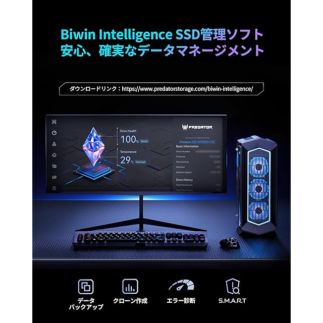 【Acer Predator GM7000 SSD】Predatorとは、最新テクノロジーを搭載し、幅広いラインアップを揃えたAcerのゲーミングシリーズです。その傘下の最新のGen 4x4 NVMe コントローラと3D TLC NANDに基づいて設計されたGM7000 M.2 SSDは超高速かつ安定感のあるパフォーマンスを提供できます。ゲームやアプリケーションのロード時間から、ストリーミングやキャプチャまで、システム全体の応答性が大幅に向上します。