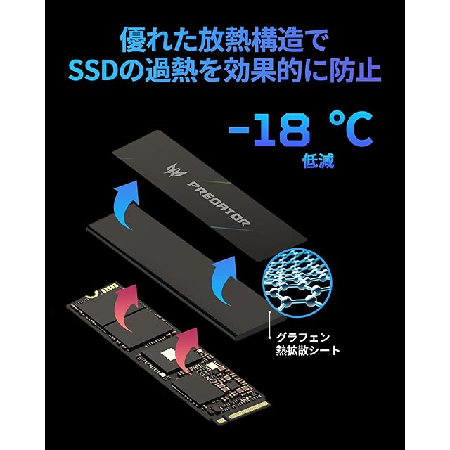 【Predator独自の熱管理技術】GM7000は高度な複合電源IC(PMIC)を搭載しており、電力の効率的な分配により節電・省エネ性能が向上し、SSDの寿命を延ばすことができます。また、薄型(0.5㎜)グラフェン・アルミニウムヒートスプレッダーを使用しており、優れた放熱性能でドライブの過熱を防ぎ、最高のパフォーマンスを維持可能。