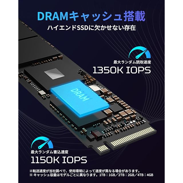 Acer Predator GM7000シリーズM.2 SSDには最新のGen 4x4 NVMe コントローラと3D TLC NAND が搭載され、データの読み書きが劇的に速くなり、超高速かつ安定感のあるパフォーマンスを提供。ゲームやアプリケーションのロード時間から、ストリーミングやキャプチャまで、システム全体の応答性が大幅に向上します。この製品はDRAMキャッシュを搭載し、データマップなどの頻繁にアクセスするデータを、DRAMへ一時的に格納することで、DRAMレスのSSDより処理速度が大幅に向上します。また、NANDへ頻繁に書き込みする必要もないため、耐久性もDRAMレスのSSDより高くなっております。長期的に安心して使いたいならDRAM搭載SSD!