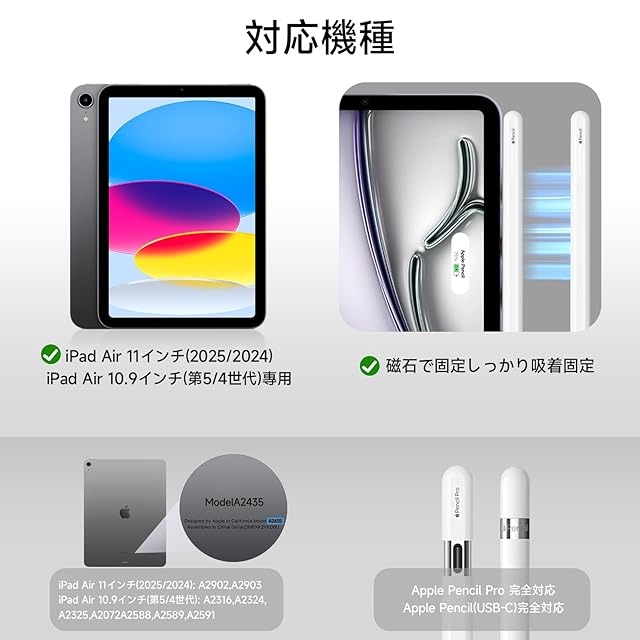 【対応機種】:iPad Air 11インチ(M3/M2、2025年/2024年モデル)、iPad Air 10.9インチ(第5世代/第4世代、2022年/2020年モデル)に対応しています。対応モデル番号:A3266、A3267、A2902、A2903、A2316、A2324、A2325、A2072、A2588、A2589、A2591。ご注意:iPad 11世代(11インチ)およびその他のiPadモデルには対応しておりません。互換性の確認は、お手持ちのiPad本体背面下部に記載されているモデル番号(「AXXXX」)をご確認ください。