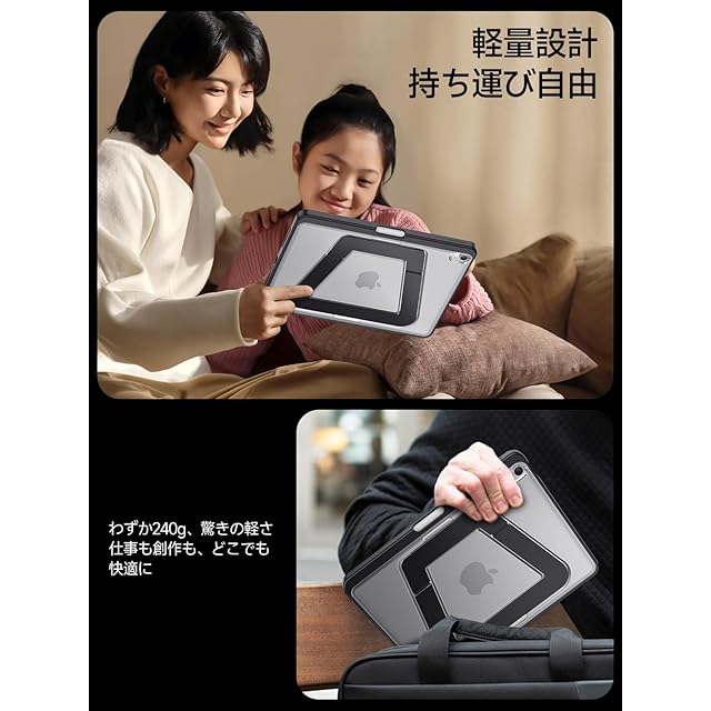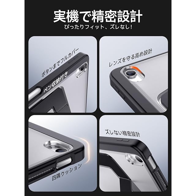 【米軍MIL規格・縦置き/横置きスタンド】 iPad Air 11インチ ケース M3(2025)・M2(2024)対応 iPad Air 第5/4世代(2022/2020)専用カバー アルミ調節式 縦横スタンド ペンシルホルダー付き 薄型 軽量 耐衝撃 半透明カバー (ブラック)