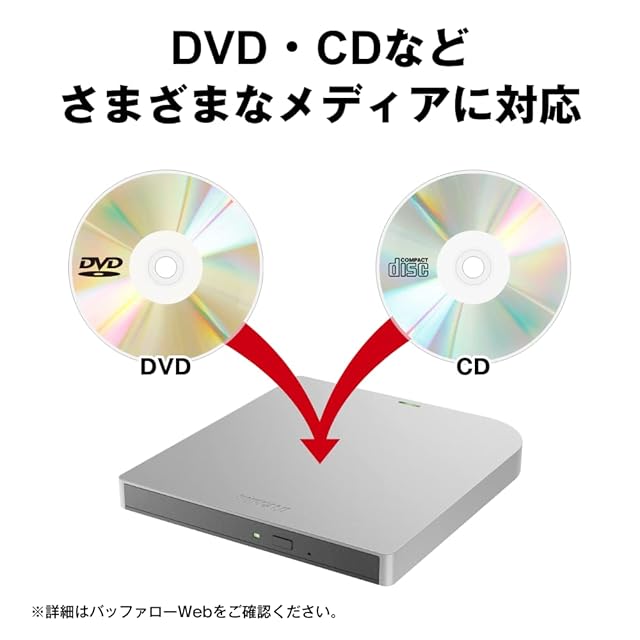 商品名:バッファロー USB3.2(Gen1)/3.0 外付け Mac 対応 DVD/CDドライブ バスパワー(給電ケーブル付き) 薄型ポータブル 国内メーカー シルバー DVSM-PMV8U3-SV/N