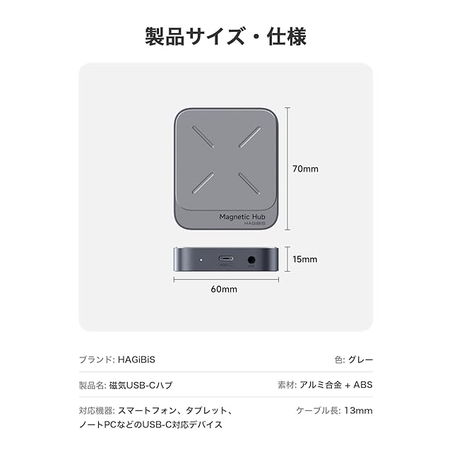商品名:Hagibis 磁気USB-Cハブ 7-in-1 Magsafe対応 ドッキングステーション|iPhone 16/15 Pro Max & MacBook Pro/Air対応|4K@60Hz HDMI・100W PD急速充電・10Gbps USB・SD/TFカードリーダー・AUX