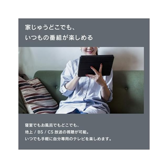 【家じゅうどこでも、いつもの番組が楽しめる】ネットワークがつながる場所なら、寝室でもお風呂でもどこでも、地上 / BS / CS放送の視聴が可能。特定の場所に縛られることなく、いつでも手軽に自分専用のテレビを楽しめます。※ 本製品とWi-Fiルーター(別売)とは有線LANでの接続が必要です。