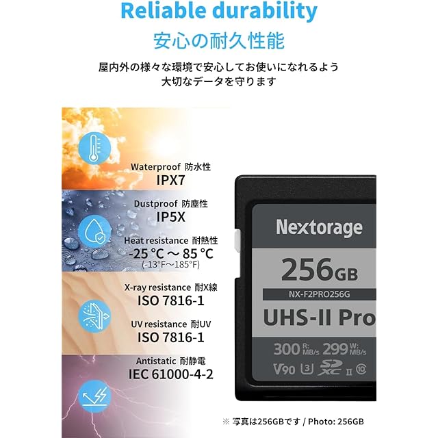 Nextorage NX-F2PROシリーズ UHS-II SDカードは、最大転送速度(読み出し:300 MB/s・書き込み:299 MB/s*)はUHS-II規格値のほぼ上限となる転送速度を達成しており、撮影から撮影後のデータ転送作業にいたるまで快適なワークフローを提供するメモリカードです。また、高頻度の書き換えに強いpSLC NANDメモリの採用により、データの保存性と耐久性に高い効果を発揮します。(*Nextorage 内部テストによります。実際の性能は環境によって異なる場合があります。UHS-II 非対応の機器では、インターフェースの制限により伝送速度が異なります。) SDビデオスピードクラスでSDXCカード最上位規格のV90(最低転送速度:90 MB/s)に準拠しており、4Kや8Kでの高精細な動画撮影やRAW画質での高速連写に対応します。高速データ転送により、デジタル一眼レフ・ミラーレスカメラやプロ用シネマカメラ等での安定した8K動画撮影をサポートします。高速書き込み性能によりバッファ解放時間(データの書き込みが完了するまでの時間)が短縮されスポーツや鉄道、動物などの連続撮影で決定的な瞬間を逃しません。連続撮影から撮影画像チェックへの流れも、より少ない待ち時間でスムーズに行えるため、書き込み待ちのストレスから解放されます。
