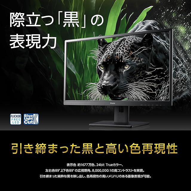 [画面]23.8インチ /1920×1080 フルHD /VA方式パネル /ノングレア(非光沢) /表示色:約1,677万色 /左右各89°上下各89°の広視野角 /アスペクト比:16:9