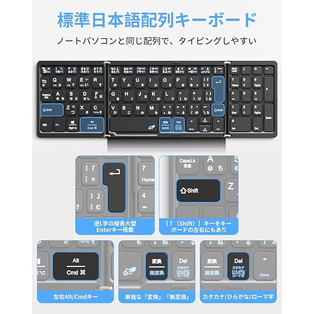✅【使い慣れた標準JIS配列&単独一行ファンクションキー】折りたたみ キーボードは標準日本語配列でかな入力もローマ字入力も対応できます。また、単独一行のファンクションキーで、一つのキー押すだけでコピーや切り取り、貼り付けなどを実現でき、タイピング中都度手を止まる必要がありません。