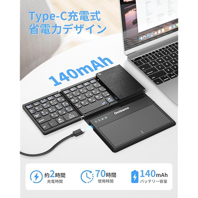 商品名:【最新型】Omikamo キーボード bluetoothと2.4GHzUSB無線 折り畳み式 JIS標準日本語配列 大型タッチパッドとテンキー搭載 4台デバイス切替 左右Shiftキー/L型Enterキー搭載 ワイヤレス iPad mini スマホ iOS/Windows/Mac対応 軽量 薄型 パンタグラフ 充電式 (黒)