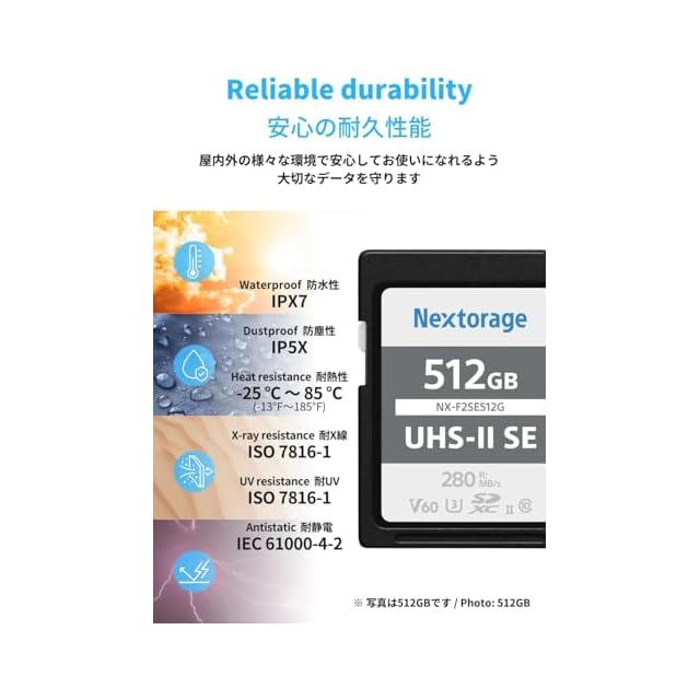 商品名:Nextorage 日本メーカー UHS-II V60 512GB SDXC SDカード 最大読出し速度280MB/s 最大書込み速度150MB/s 4K録画 NX-F2SE512G ネクストレージ メモリカード