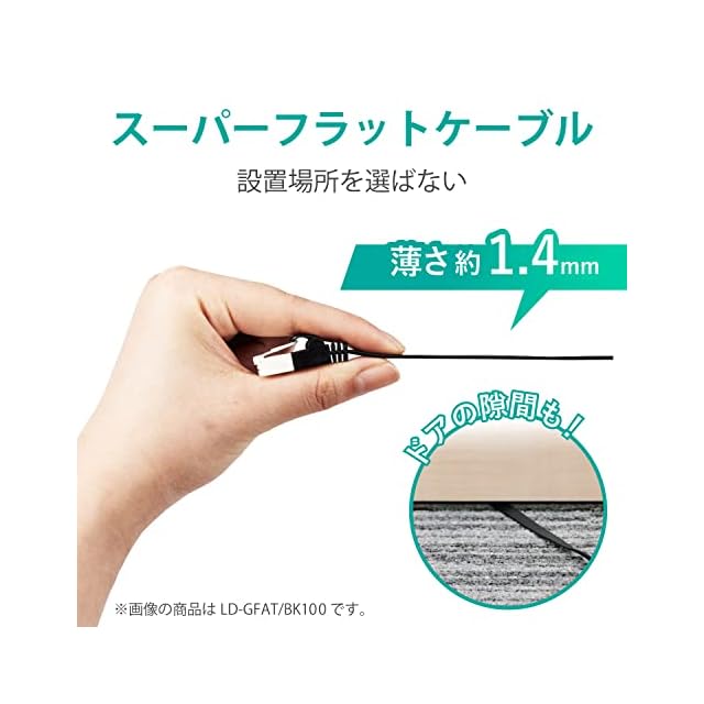 カーペットの下やドアのすき間に配線できる薄さ約1.4mm、幅約6.4mmのフラットタイプです。