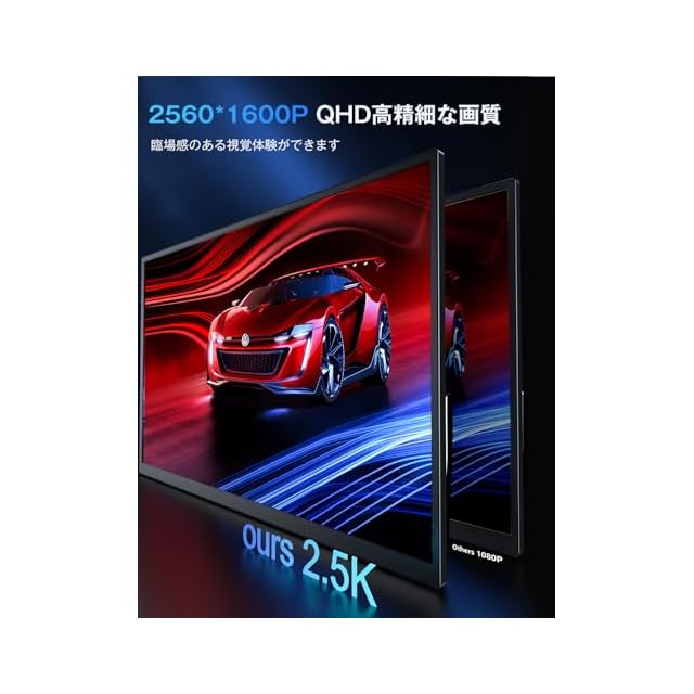 【2.5K高画質・100% sRGB広色域】ポータブルモニターは美しい映像が楽しめる2.5K解像度です。2.5K解像度は(2560×1600ピクセル)、フルHDの2倍の画素数で鮮やかな表現力を実現し、ゲームや映画を楽しむ時にリアリズムを体験できます。sRGBカバー率100%を達成した広色域、豊富な色彩と自然な画質が表示できます。1200:1 の高コントラスト比で、低階調や明暗の混在したシーンにおける細やかな表現まで忠実に映し出すことができます。可視性に優れたIPS液晶パネルを採用されるため、どの角度から見ても鮮やかな映像をみることが可能です。
