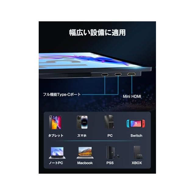 【幅広く接続に対応・ケーブル1本接続】このモバイルモニターはMini HDMI、Type-C二つが搭載されて、すべてのコンピューターと交換性があります。ほとんどのパソコン、スマホも対応できます。Nintendo Switchゲーム機、PS3、PS4、PS5、Xbox One等も簡単に繋がって、複雑な設定要らずに使用できます。何よりも便利なのは、Type-Cケーブル一本で映像出力と給電を同時に実現できます。Type C端子で接続できない端末は、HDMI接続との選択肢があります。ご注意:Type Cケーブル一本で接続する場合、接続の端末がDP ALT MODE(映像出力)に対応しなければなりません。接続端末から電源を取る場合、端末の電力低下で給電不足になることもあります。この場合、電源アダプターで給電してください。