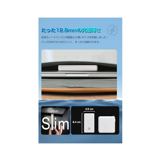 ⚡【究極薄さ12.8mm】従来のノートパソコン充電器より随分の薄さを実現しました!厚さわずか12.8mm薄さで70wの高出力の誇りも自慢できる急速充電器が登場。スリムのに2つのポートを搭載し、2台のデバイスを同時に充電可能。バッグの中でかさばりにくく、すっきり収納できます。外出や出張などの際の持ち運びに便利です。