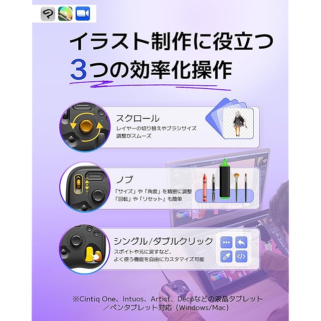 【イラストレーター向け3つの操作】 ホイールでブラシやレイヤーを瞬時に切り替え 、ダイヤルでキャンバスの拡大/縮小/回転/リセット、 カスタムボタンでスポイトや元に戻すを即操作。Cintiq、Artist、Intuosシリーズ対応。