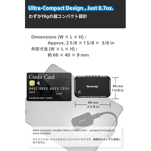 クレジットカードサイズのUSB3.2 Gen2x2 対応のPortable SSD。約66mm x 40mm x 9mm (最大突起物を除く), 本体 約19g