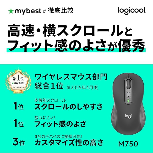 Signature M750/レギュラーサイズ/勢いよく回すと高速スクロールに自動で切り替わる/独自のSmartWheelを搭載したフィット感抜群の静音ワイヤレスマウス