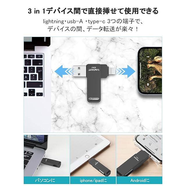 商品名:Vackiit「Apple MFi認証取得」iPhone用 usbメモリusb iphone対応 Lightning USB iPhone用 メモリー iPad用 フラッシュドライブ (ブラック, MFI 認証済み 128GB)