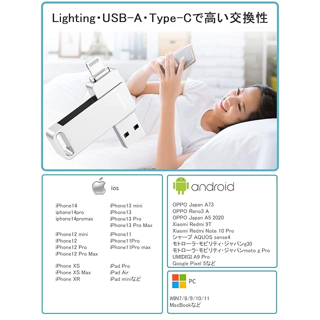 「安心して使えるMFI認証iPhone usbメモリ」当社のusbメモリはApple社のMFi認証取得を取得、認証番号。Made for iphone/ipad認証Lightning USBメモリは安定したデータ通信が可能で 、IOSを最新版にアップデートしても、引き続き使用出来ます。
