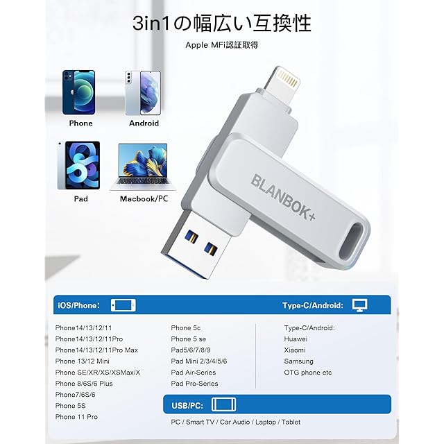 【多機種対応 iphone データ保存】本USBメモリは、iOS/USB/Type-C/micro USBの4種類の接続端子を搭載しており、PC・Android・MacBook・iOS機器で手軽にデータをバックアップできます。iPhone 17 / 17 Air/ 17 Pro / 17 Pro Max/iPhone 16Pro Max/16 Pro/16 Plus/iPhone16/15 Pro Max/15 Pro/15 Plus/15/14 Pro Max/14 Pro/14 Plus/14/SE3/13シリーズ/12シリーズ/11シリーズ/XR/XS/X/8/SE2、iPad Air(第1〜3世代)、iPad mini(第1〜5世代)、iPad(第5〜9世代)、MacBook(Pro/Air)、各種Androidスマホやタブレットなど幅広いデバイスと互換性があります。
