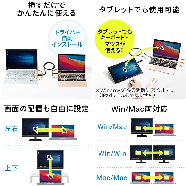 タブレットPCなどキーボード・マウスを持たないパソコンとのデータ転送・操作にも最適です。(WindowsOS搭載機に限ります。 (iPadには対応しません))