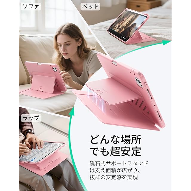 【超安定スタンド】:広いカバー面と強力なマグネットブラケット設計により、机やソファ、ベッド、膝上などどの場所でも安定して立てられ、滑りにくく安心です