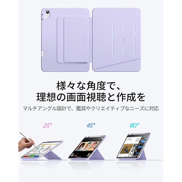 【マルチアングルデザイン】:2つのスタンドモードに対応しており、45°~60°はビデオ鑑賞、作業、FaceTimingなどに最適なビューイングモードへと、25°に調節した場合は執筆、絵画、その他のクリエイティブな作業に最適なライティングモードへと用途に合わせて角度調節が行えます