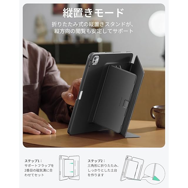 【角度調節でもっと使いやすく】:横向きは3段階の角度調整に対応し、縦向きは独自開発の「三角ダブルロック構造」によって安定したスタンド機能を実現しました。動画視聴からSNSチェックまで、マグネットスタンドのしっかりとした固定設計により安心してお使いいただけます。縦向きで使用する際は、カバーを2番目のマグネット位置にセットし、小さな三角パーツを外側に折り込むことで自立が可能です(内側に折り込んでのご使用はお避けください)