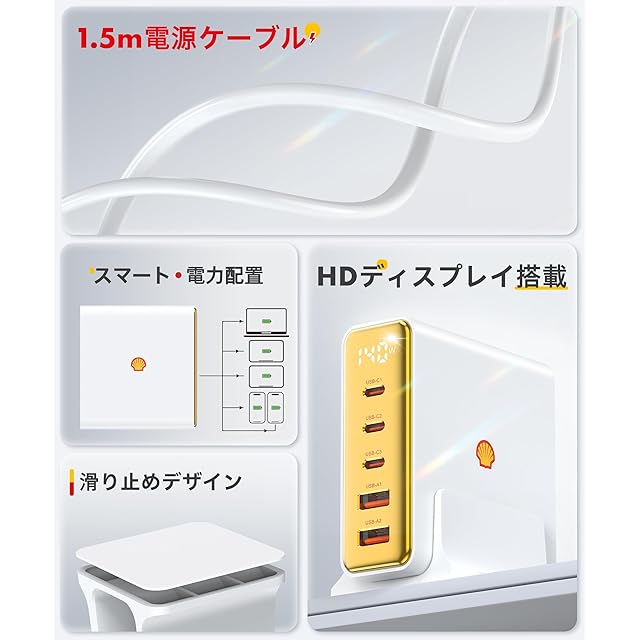 Shell 急速充電器 合計140W高出力 5台同時充電 (USB-C*3+USB-A*2) GaNIII技術 ディスプレイ搭載 PSE認証済 PD3.0/QC4+規格対応 1.5m電源ケーブル付き 出張/旅行に最適 MacBook Pro/iPad/iPhone17/16/15/14/13/Android各種対応