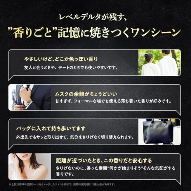 【レベルデルタが残す、"香りごと"記憶に焼きつくワンシーン】 やさしいけど、どこか色っぽい香り デートにも普段使いにも◎ ムスクの余韻がちょうどいい 甘すぎず、フォーマルにも使える バッグに入れて持ち歩いてます 外出先でも気軽に香りチェンジ 距離が近づいたとき、安心感をくれる香り さりげないけど、心を動かす「なにか」がある