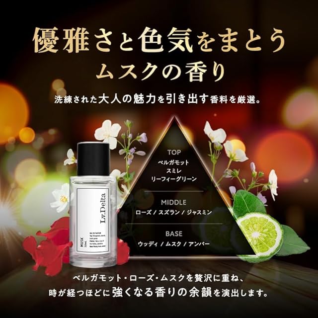 【SNSで話題!あの人もオススメ!】 「近づいた瞬間、ドキッとする。」 清潔感があるのに、どこか色っぽい。そんな香りについ目で追ってしまう。 ——現役レースクイーン 西野理沙さん 推薦! 「特にデートシーンでおすすめ」 ふんわり優しく香るから、お腹や足首につけるのが◎ ——美容ファッションインフルエンサー 本田理暉さん(フォロワー20万人超) 【Q. 男性のどこに魅力を感じますか?】 1位:匂い(59%が回答!) 2位 筋肉/3位 顔/4位 身長 (※自社調査:2025年4月・調査人数100名) 視覚に頼りがちな男性と違い、女性は空気感や香りで“いい男”を見極める。 「近づいたときの香り」が見た目以上に印象を残すのです。 【優雅さと色気をまとう、ムスクの香り】 ベルガモット・ローズ・ムスクを贅沢に重ね、 時が経つほどに強くなる余韻を演出します。 TOP:ベルガモット/スミレ/リーフィーグリーン MIDDLE:ローズ/スズラン/ジャスミン BASE:ウッディ/ムスク/アンバー 【この香水、反則級】 “ふと蘇る香り”から生まれた一本。 「あれ、またあの人の香りがする」 ——そんな、忘れられない香りを目指しました。 \勝負シーンの味方に!/ ・デートや記念日には、首筋・うなじ・手首にひと吹き ・ウエストや膝裏に仕込めば、さりげなく香りが広がり印象を引き寄せる 【レベルデルタが残す、"香りごと"記憶に焼きつくワンシーン】 やさしいけど、どこか色っぽい香り デートにも普段使いにも◎ ムスクの余韻がちょうどいい 甘すぎず、フォーマルにも使える バッグに入れて持ち歩いてます 外出先でも気軽に香りチェンジ 距離が近づいたとき、安心感をくれる香り さりげないけど、心を動かす「なにか」がある 【レベルデルタの重ね技】 もっと“忘れられない男性”へ。 ヘアミルク:朝のスタイリングに1プッシュ 香水:大切な人に会う直前にもう1プッシュ ※ヘアミルクは別売りです