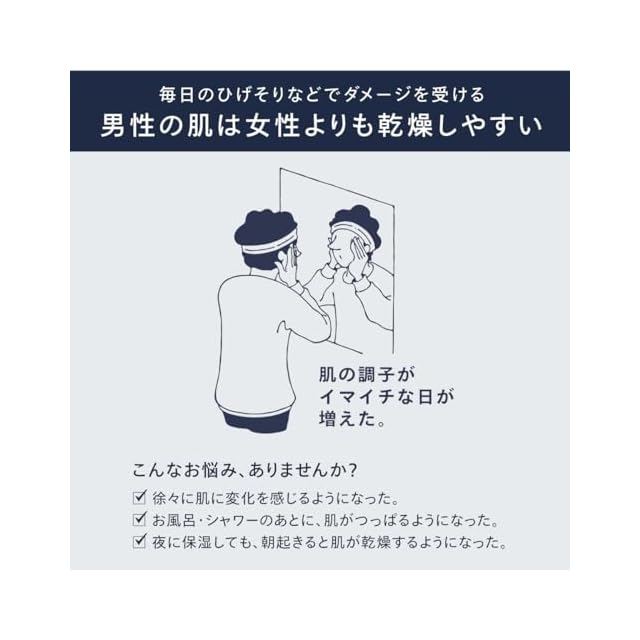 【商品特徴】いい自分、続く。健やかで快適な肌に。男性特有の「うるおい流出ループ」をブロック。<br><br> 【厳選された成分をギュッと凝縮】とろみのあるテクチャーで、塗った瞬間すっと肌になじむ。【1本で、1日中*1うるおいが持続。】*1 朝と夜に使用した場合。<br><br> 【テクスチャー】とろみのあるテクスチャーで、塗った瞬間に保湿液がすっと肌になじみます。<br><br> 【香り】爽やかで落ち着きのあるフローラルグリーンの香り<br><br> 【上質感にこだわった製品デザイン】ノッチをアクセントにした端正なフォルムに、深海を思わせるブルーブラックのグラデーションをかけたこだわりのデザインで、「肌への深いうるおいをもたらす期待」を表現<br><br> 【使用上の注意】使用中、ポンプの押し下げ・吐出に合わせて、音が鳴ることがありますが、 製品に問題はありません。