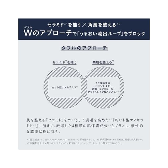 【男性特有の乾燥原因に着目】ひげ剃りなどの男性特有の生活習慣で加速する、乾燥原因「うるおい流出ループ」に着目。セラミド(*1)を補う×角層を整える(*2)ダブルのアプローチを採用。肌をうるおいで満たし、健やかで快適な肌へ誘います。(*1) 整肌成分:ヒト型セラミド(セラミドNP、セラミドAP)、ヒト型アシルセラミド(セラミドEOP)のこと。(*2) 「角層を整える」は、肌を整えるという意味です。