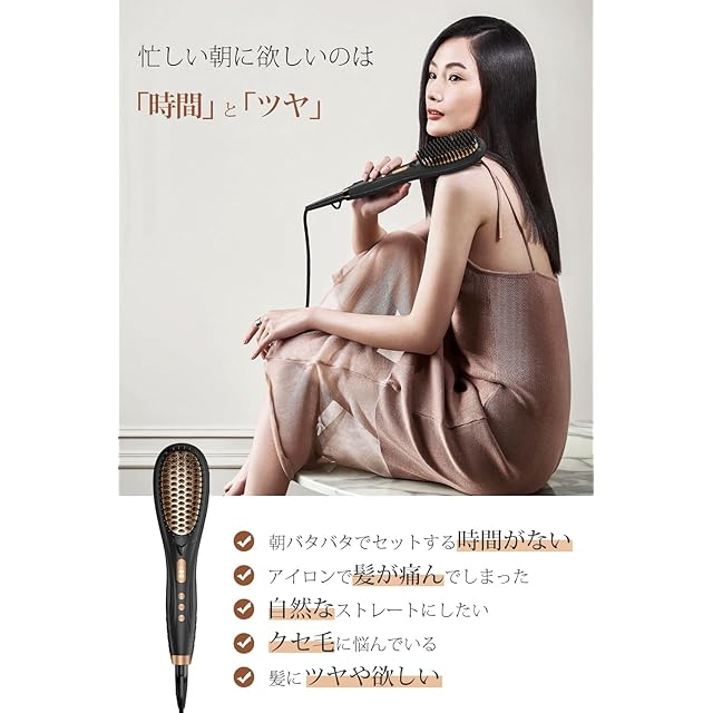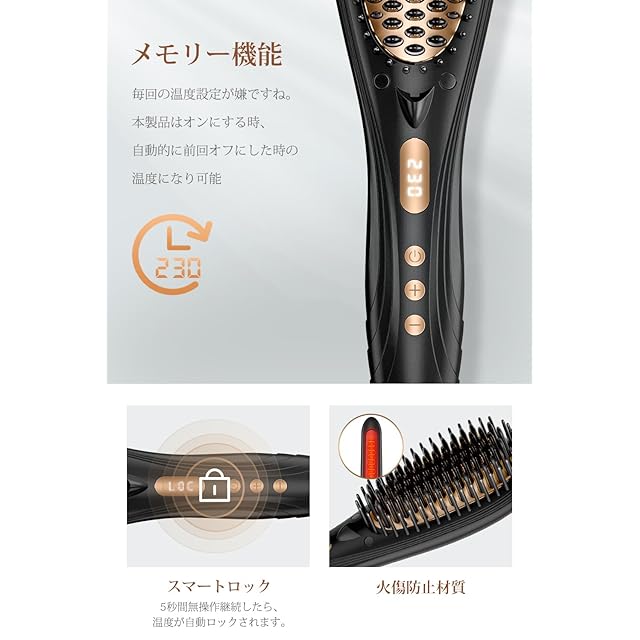 商品名:ヘアアイロン ストレートブラシ 【80℃~230℃温度調節&マイナスイオン機能】 ヒートブラシ LEDパネル 静電気防止 火傷防止 16段階温度調節可能 MAX230℃ ツヤ感UP ブラシアイロン つやのある髪 電熱ヘアブラシ 自動ロック機能 自動オフ機能 温度メモリー 誤作動防止 男女兼用 耐熱軍手付属 日本語取扱説明書 (ブラック)