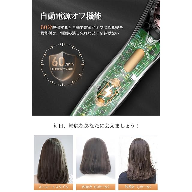 【海外対応&60分自動OFF】 ヘアアイロンブラシは100V~240Vに対応し、海外旅行でも使用可能。耐熱袋付きで持ち運びや収納も簡単です。安全機能として60分後に自動で電源OFFするため、切り忘れの心配もありません。さらに360°回転コードで使用中の絡まりを防ぎ、自由な角度でスタイリング可能。