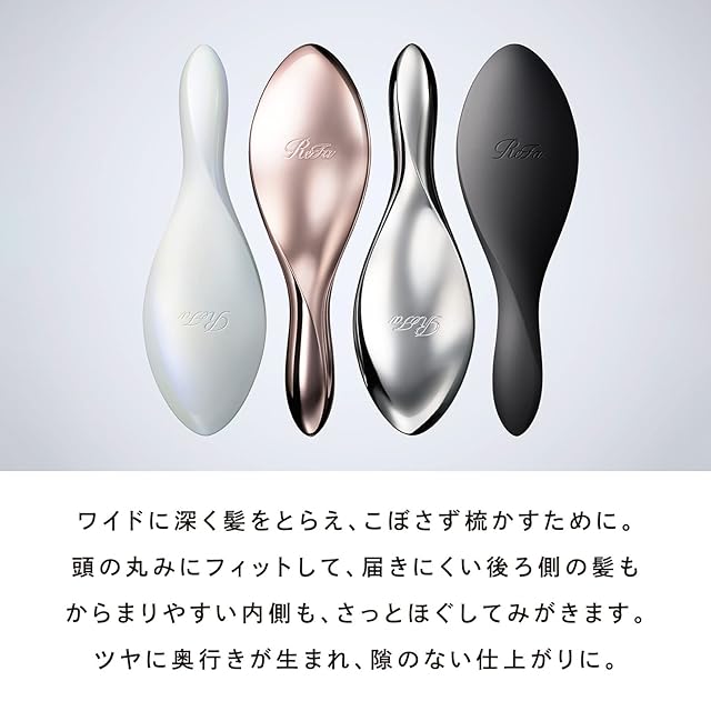 ワンストロークで、ツヤメイク。 髪、一気にまとまる。 ワイドに深く髪をとらえ、こぼさず梳かすために。 頭の丸みにフィットして、届きにくい後ろ側の髪もからまりやすい内側も、さっとほぐしてみがきます。 ツヤに奥行きが生まれ、隙のない仕上がりに。