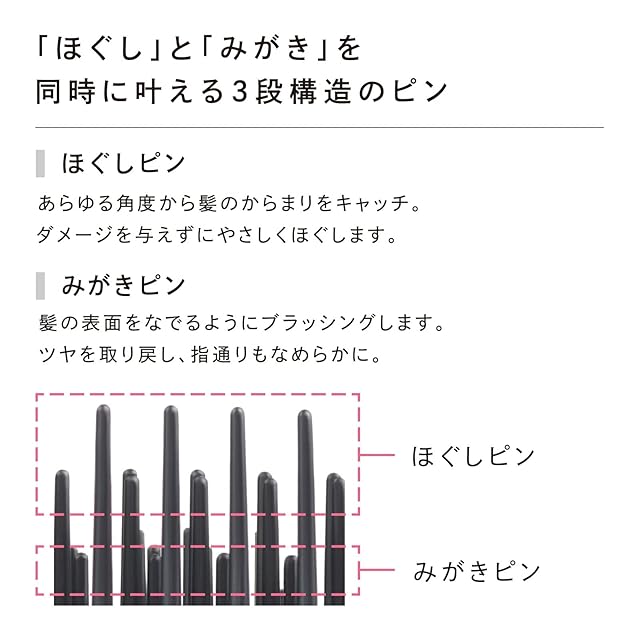 「ほぐし」と「みがき」を 同時に叶える3段構造のピン〈ほぐしピン〉あらゆる角度から髪のからまりをキャッチ。ダメージを与えずにやさしくほぐします。〈みがきピン〉髪の表面をなでるようにブラッシングします。ツヤを取り戻し、指通りもなめらかに。