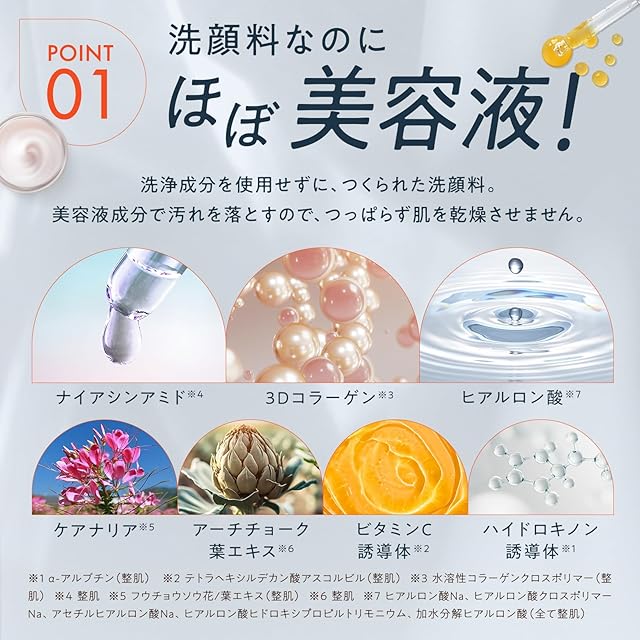 たっぷりの美容液成分を配合した洗顔ジェル。【透明感】ハイドロキノン誘導体・ビタミンC誘導体 【ハリと弾力】5種類のヒアルロン酸 【保湿】コラーゲン・スクワラン など、贅沢に美容液成分を配合。
